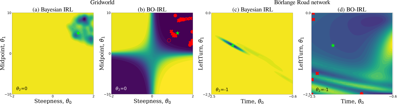 BIRL assigns high probability to reward functions adjacent to the ground truth (green star) but ignores other equally probable regions. In contrast, BOIRL has identified multiple regions of high likelihood, as shown in (b) and (d). Interestingly, BO-IRL has managed to identify multiple reward functions with lower NLL than the expert’s true reward (as shown by red crosses) in both environments.