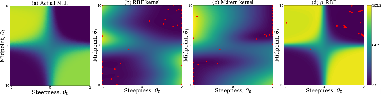 The following figure compares the learned posterior distribution over the NLL across reward functions for various kernels. As expected, 𝜌-RBF recovers the underlying structure of the reward function space without having to explore the entire space.