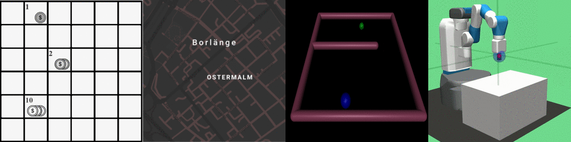 The following figure shows the environments used to evaluate BO-IRL. We applied BO-IRL to two discrete environments ((a) and (b)) and two continuous environments ((c) and (d)).