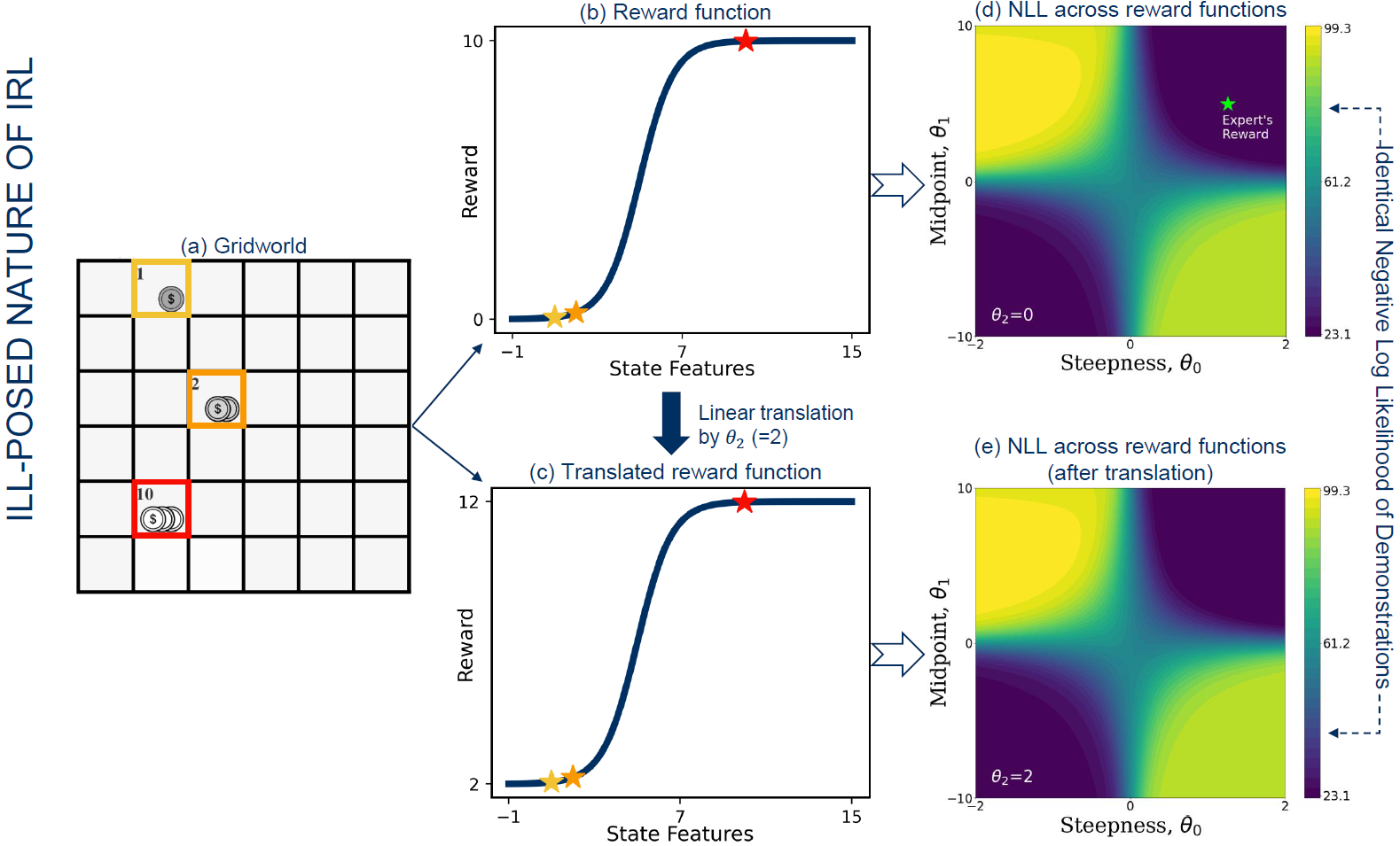 Inverse Reinforcement Learning (IRL) is an ill-posed problem as there typically exist many solutions(reward functions) for which a given behavior is optimal. This problem is made worse by policy-invariance where a reward function maintains its optimal policy under certain operations such as linear translation. Consider the example below. The reward function of the Gridworld (a) is a logistic function shown in (b). The steepness and midpoint of the curve as well as a linear translation value are the learnable reward function parameters. (d) shows the Negative Log Likelihood (NLL) of the expert demonstrations across various reward functions without any linear translation. Linearly translating (b) with a value of 2 gives rise to (c) which has identical NLL values (e) due to policy invariance.