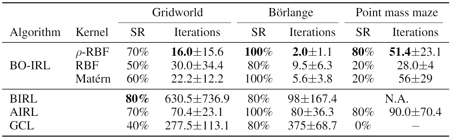 We evaluated the success rate (SR) and iterations required for various IRL algorithms to achieve the expert’s expected sum of rewards (ESOR) in three of the environments. The following table shows that BO-IRL with 𝜌-RBF kernel reached expert’s ESOR with fewer iterations than the other tested algorithms across all the settings. Further details can be found in the paper.