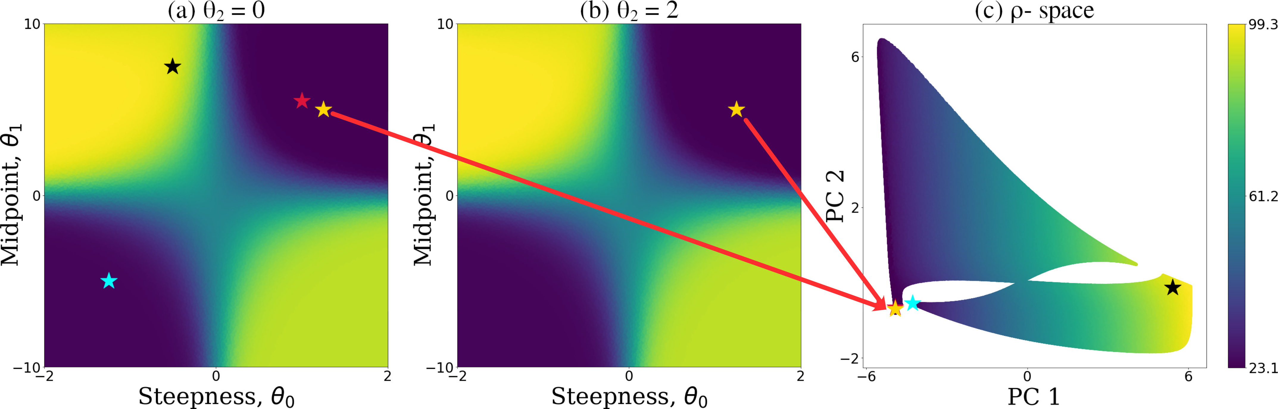 The following illustrates 𝜌-projection in action. Figures (a) and (b) represent NLL values of two sets of policy invariant reward functions that are linearly translated. (c) shows the corresponding 𝜌-space where the policy invariant reward functions (yellow stars) are mapped to the same point and points that are close in its range correspond to reward functions with similar NLL (red, yellow and blue stars).