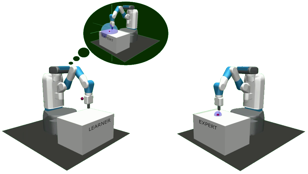 The following video shows BO-IRL being applied to the Fetch-Reach environment. The learned parameters are the distance threshold around the goal (indicated in blue circle) and a penalty imposed when outside the threshold. Within 11 iterations, the robot learns the expert’s reward. Specifically, this reward imposes a small region of threshold around the goal. Interesting, as the training progresses, the robot identifies more rewards that have higher likelihood than the expert’s reward. For instance, by iteration 90, the robot has discovered that the expert’s behavior can be achieved by having a wide threshold region and adjusting the penalty accordingly.